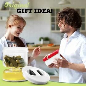 • This jar can cleverly separate liquids from food and will not easily spill when you turn it upside down for storage because of its hourglass and sealed lid design.
